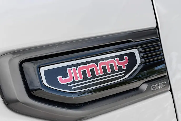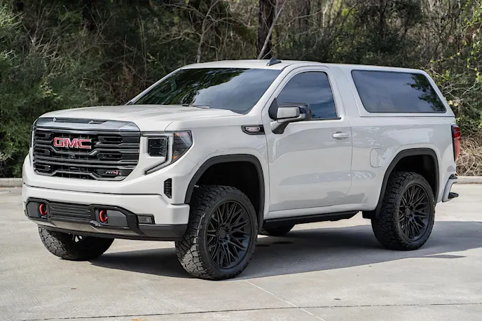 While perusing the auction site Bring A Trailer I came across this 2022 GMC Jimmy that I had recently seen in person at the 2023 SEMA Show. It is build number three from Flat Out Autos and only has 212 miles on the odometer. This Jimmy started life as a regular cab long-bed GMC Sierra AT4 four-wheel-drive pickup truck before going under the knife. The talented team at Flat Out Autos shortened the frame to match the now extra-short five-foot, eight-inch bed. From there, the bed and cab are mated together to form a unibody, just like the original Jimmy. The back of the cab is removed to create an open interior and access to the rear power-folding bench seat. A custom bed cap that is removable for open-air cruising and offroading completes the exterior transformation from a Sierra pickup truck to a Jimmy SUV.