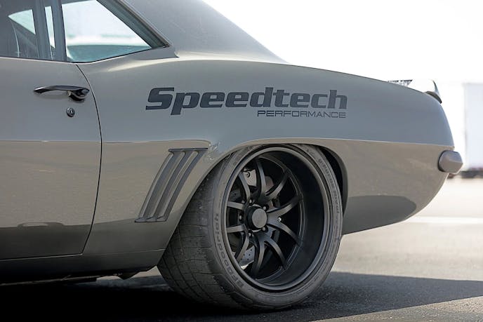 A pro-touring build would not be complete without a high-performance suspension setup. This Camaro uses Speedtech components throughout for handling the twisties with ease including their front subframe, frame connectors, torque arm, and upper and lower control arms. To smooth out the bumps and keep the car planted coilovers are at all four corners. Providing the grip are steamroller-wide BFGoodrich g-Force Rival tires measuring 315/30/18 up front and 335/30/18 out back. Black-finished American Racing 18-inch wheels complement the colors of the Camaro’s exterior.