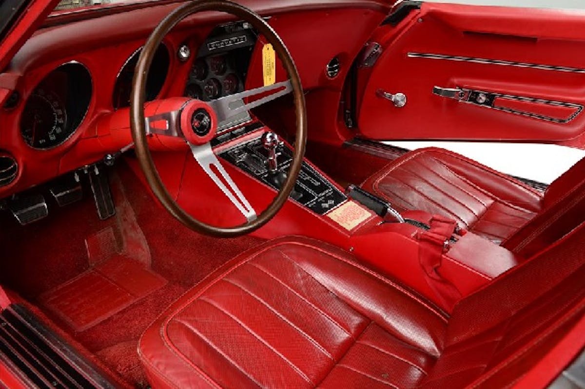 With only 24, 760 actual miles, this car has been faithfully pampered and meticulously maintained. There has been some restoration, as the bright red paint has been professionally redone with period-correct lacquer, and the factory 427 ci, 430 hp L88 motor has been rebuilt, but it still has the original red leather interior, factory radio delete, and removable back window. It also has a period-correct drivetrain, featuring a M22 Rock Crusher four-speed and a tall 4.11:1 rearend gear ratio.