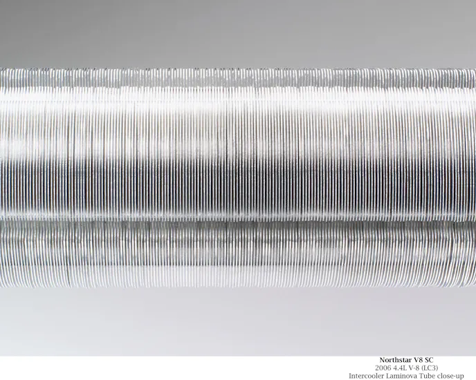 The M122 supercharger contains everything from intake, supercharger, and intercooler which features four Laminova laminar flow heat exchange tubes (right). According to Mack Daddy Parts, the entire install is about 9 inches off the valve cover. Not much taller than a factory truck intake. Images: CadillacForums.com