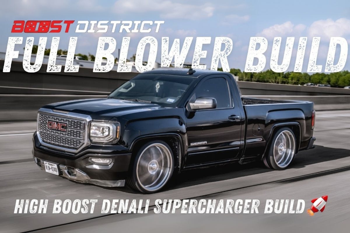 The 2016 single-cab boosted Denali giveaway truck is getting closer to its final form, and this episode from Boost District focused on the biggest step yet: installing a Magnuson 2650 supercharger. The team wasted no time tearing into the bay, pulling fans, hoses, and the belt drive apart to make room for the new setup.