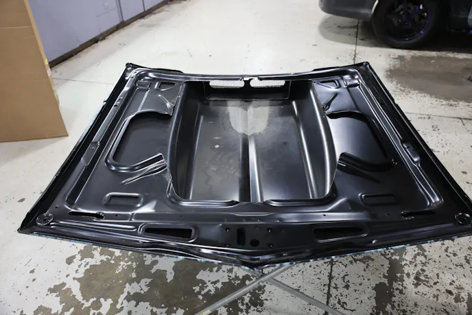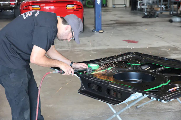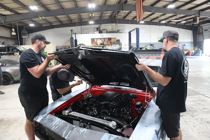 Relieved and happy that goal number two was achieved, we moved our focus back to wrapping up the remaining items on our list so Project 899 would be ready for the track. The new hood from Auto Metal Direct looked great, but it required a modification to clear the top of the Whipple supercharger. Bob made quick work of removing some of the metal from the underside of the hood so we could bolt it to the new Eddie Motorsports billet hinges. The antiroll bar and a driveshaft safety loop were finished up, and a change in front ride height was also made.