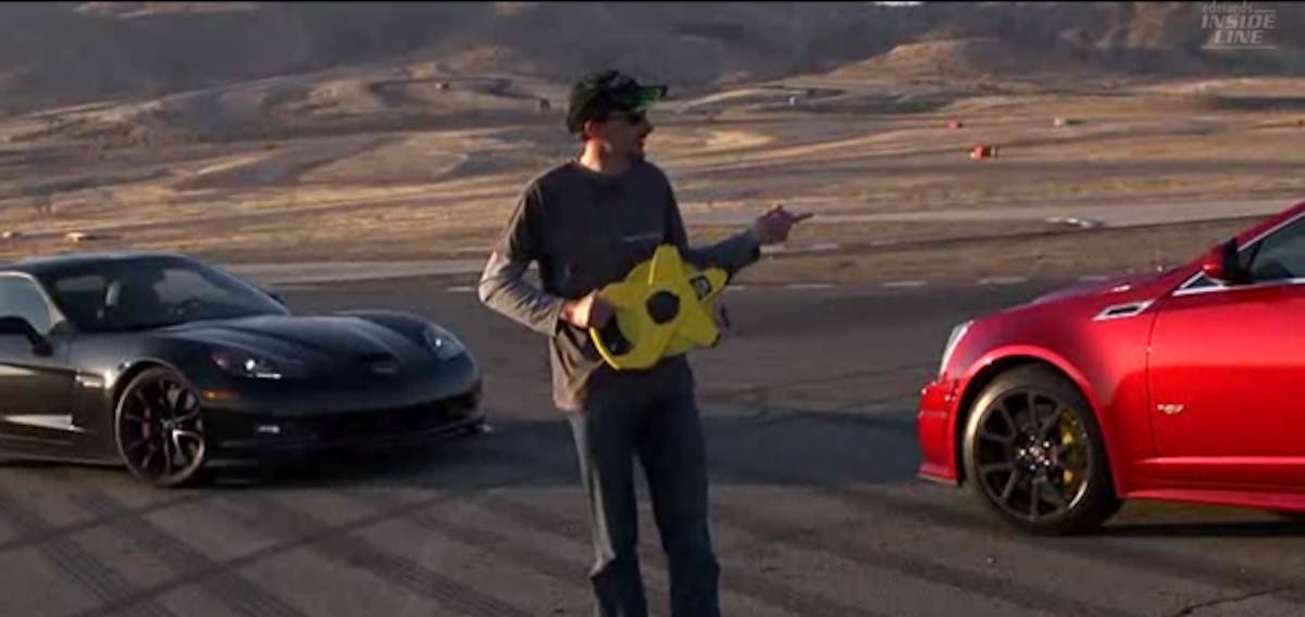 Senior Editor Jacquot jumps behind the wheel of the CTS-V and proceeds to roast the ever-living crap out of the tires; however the Caddy needed a little extra help to get the tires spinning properly and a little power brake action did just the trick. With the requirement for power braking the CTS-V an automatic disqualification in most cases, the guys at Inside Line decided to cut the so called “gentleman’s car” a little slack in the competition.