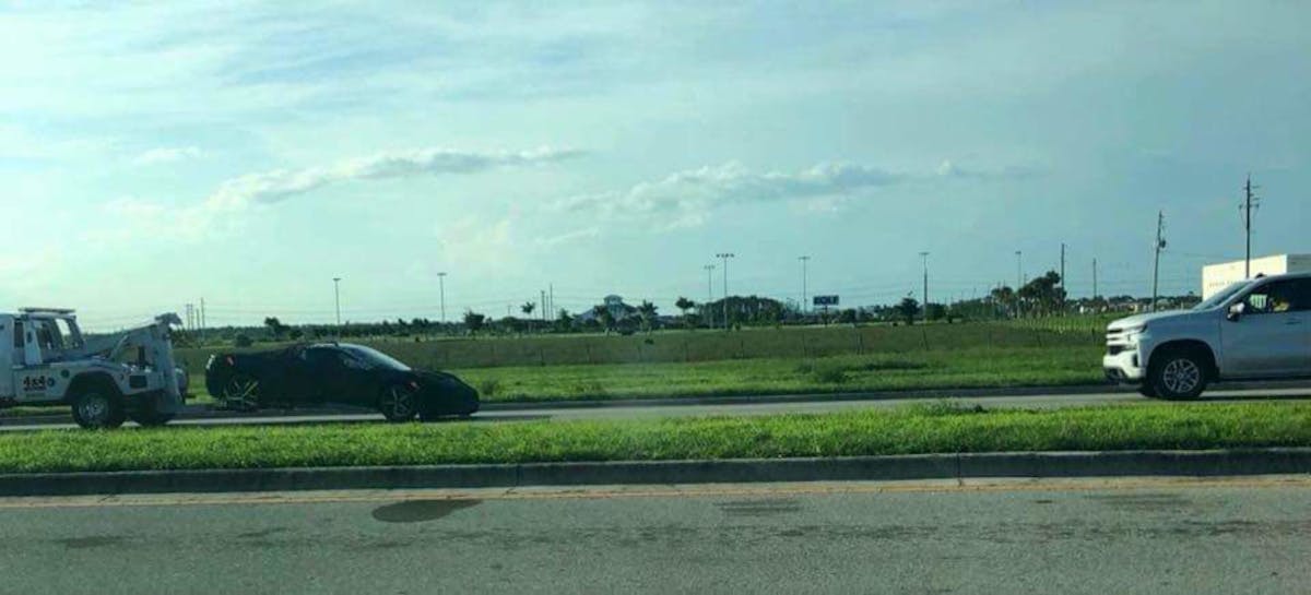 Namely, when was the first time you saw a Corvette with a rear-hinged hood that opens in the front? Answer—in these photos! Also, you can see what appears to be jumper cables coming from the front of the truck and, we can guess, heading to the C8. Now, does that mean simply that the battery was dead? We’re not sure.