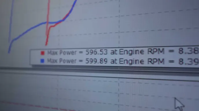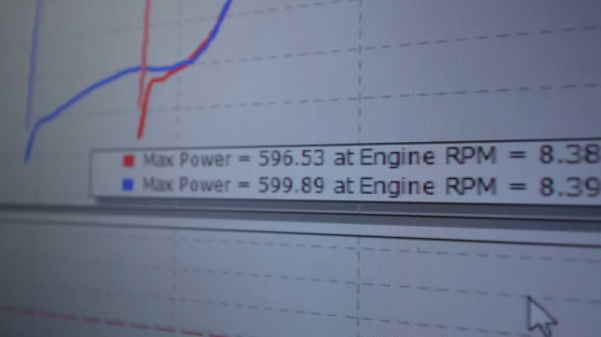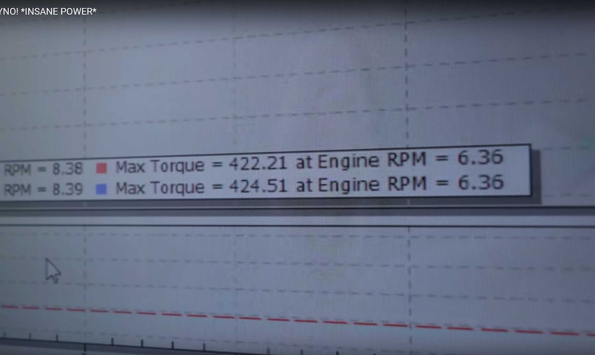 Just before the throttle bodies go wide-open, Austin (Speed Phenom) asks Shawn at Dallas Performance how much he thinks the car will make. Shawn quickly replies, “Around 600.” At first, when you consider the amount of parasitic loss of power through the typical driveline, you might deem this number a bit overly enthusiastic. But Shawn is well-versed in all things mid-engine and transaxle, and the first dyno run confirms this fact with a power output of 596 horsepower at 8,300 rpm.