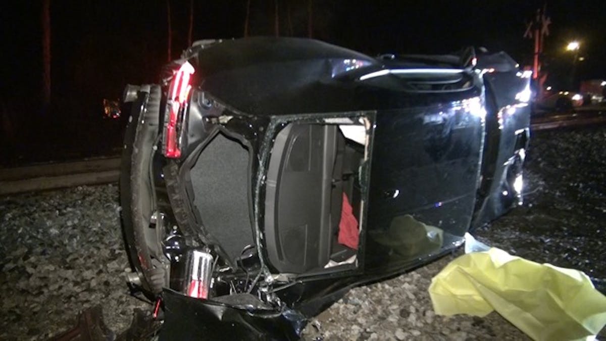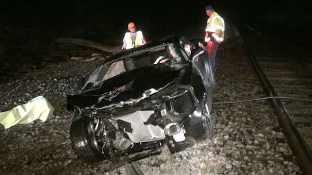 camarovtrain1Typically, when you hear about a vehicle getting hit by a train, it’s the result of an impatient driver trying to beat the train through a crossing, or getting stuck on the tracks due to traffic or a mechanical breakdown. This incident, brought to us by the Montgomery County Police Reporter, is more of a “Man bites dog” story, though. In this late-night crash last Wednesday, a new 5th Gen Camaro left the road at a high rate of speed on a curve near a gated crossing and ended up hitting the side of a freight train at a 45 degree angle.