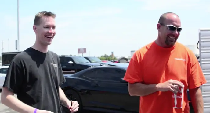 The unsuspecting (and lucky) individual was family man and Camaro enthusiast Justin (pictured left) who just a few weeks prior to shooting this video had experienced a blower belt failure that ruined his Camaro’s hood and rendered it undriveable. When the belt failure occurred, Justin and his long time friend Don (pictured right) were left stranded and scrambling for ideas on how to get themselves back on the road. Thankfully for them, they met Tommy of HALO Supercars who was more than willing to help. Tommy was able to find them a replacement belt and various other parts at 5 pm on a Friday night to get them back on the road.