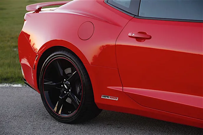 The chassis dyno calibration means that the new owner will receive a before-and-after dyno graph report which discloses the power and torque made, measured at the rear-wheels. The new owner can also expect up to 100 miles of road testing on the Camaro, all of the necessary gaskets and fluids replaced (including an oil change using Pennzoil Ultra Platinum synthetic oil and oil filter), and a half of a tank of Shell V-Power Nitro+ 93-grade gasoline upon delivery. The finishing touches on the package include signature HPE650 and Hennessey badging on the exterior and interior of the Camaro, as well as a HPE650 serial numbered plaque signed by John Hennessey (interior) and a matching plaque in the engine bay of the HPE technician who built the car.