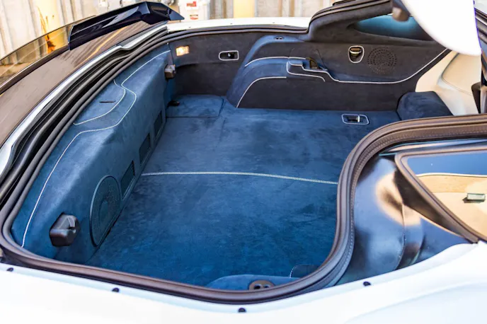 The interior is an exercise in indulgent luxury. Every panel is meticulously stitched in furniture grade blue and white leather. Be sure and check out cargo area and custom sewn floor mats