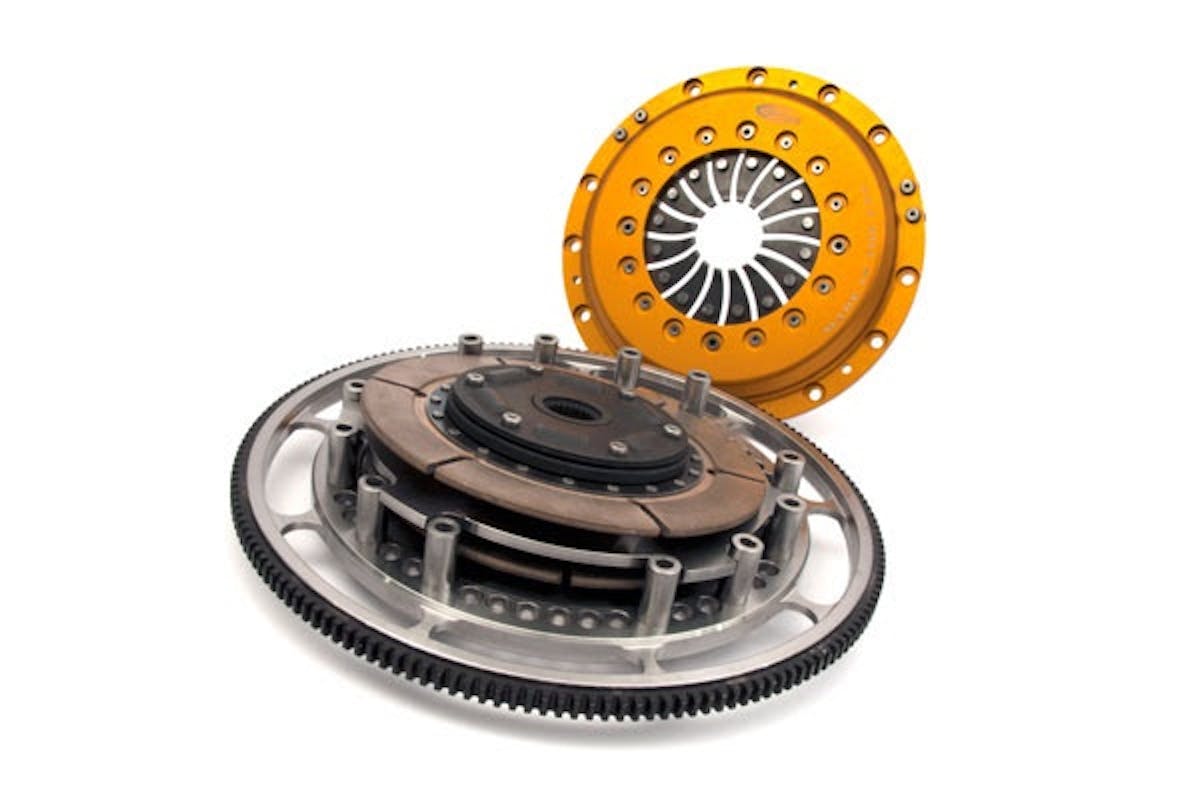 Now, Centerforce steps up the game again with the introduction of the new DYAD RS Twin. It shares much of the same multi-disc technology with the existing DYAD line, but incorporates a host of weight-savings measures: namely a gold-anodized billet aluminum pressure plate in place of the standard stamped-steel unit and a low-inertia flywheel that’s significantly lighter than stock. Less weight translates to faster acceleration. Best of all, the lightweight system is engineered to hold more than 800 lb-ft of torque.