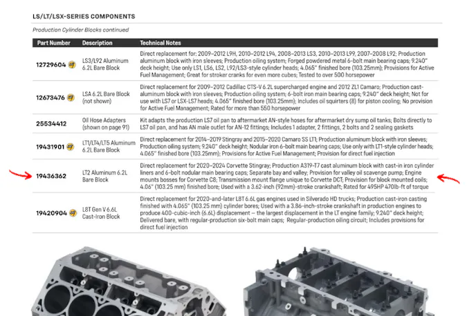 Snuck into the 2025 Chevrolet performance catalog on page 88 is the new-to-the-public C8-specific LT2 engine block.