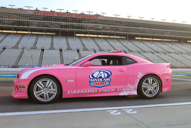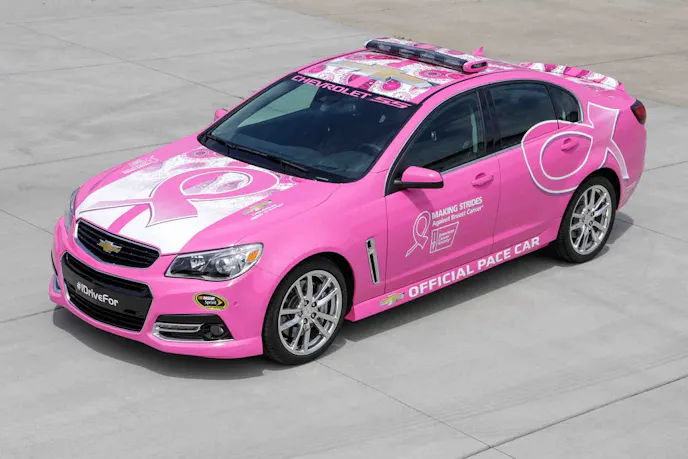 Chevrolet is participating in National Breast Cancer Awareness Month, with its most visible contribution being a pink-painted Chevy SS pace car for the NASCAR Sprint Cup Series. For each lap the pink SS makes at Talladega Superspeedway on October 25 and Martinsville Speedway on November 1, Chevy will donate $350, all the way up to $50,000. Chevrolet did something similar back in 2012 with a pink Camaro, so you know this pink SS sedan is in good company.