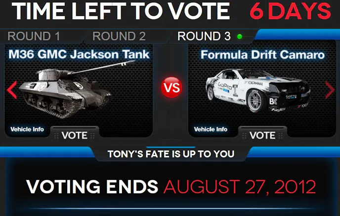 The contenders were a Bondurant LS3 powered Corvette Grand Sport, the Mobil 1 Formula Drift Camaro, a World War II Era Tank, and (…ready for this?) – a Chevy Astro Van. In the first round the tank crushed the Astro Van (not litterally,of course), and in round two the Camaro handily beat out the Grand Sport. Now, we’ve commenced the third and final round of voting to determine which of these two vehicles Stewart will have to step out of his comfort zone to pilot for our entertainment.