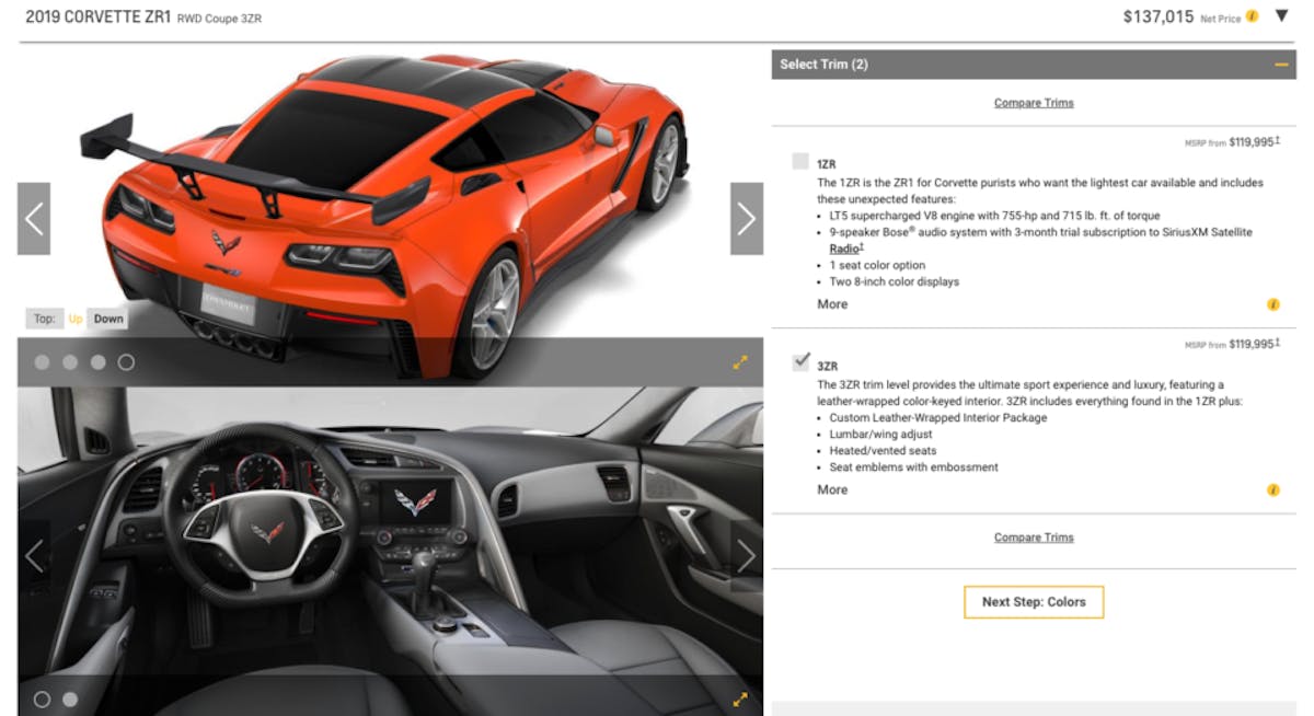 But what does that translate to in the real world? Well, the first step in the configurator is to select trim levels. You have the option of the 1ZR or the 3ZR (not sure where 2ZR disappeared to) and while the fine print shows that both options start out at 119, 995, the Net Price calculator in the upper right-hand corner begs to differ. Up gunning your ZR1 to the 3ZR package, which includes the leather-wrapped, color-matched interior, heated and cooled seats, and seat emblems with embossment, amongst other things, will set you back a cool $10,000.
