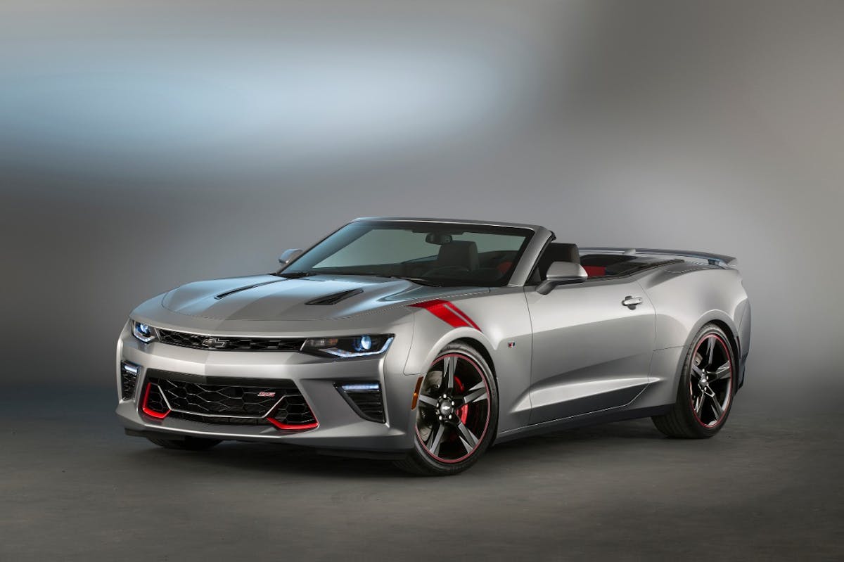 cq5dam.web.1280.1280 (24)The Red Accent Package concept comes equipped on a 2016 Camaro SS convertible painted in a subtle Switchblade Silver Metallic tone. Among the production mods is a lower grille with red inserts, red “hash mark” fender graphics, black bow-tie emblems, and 20-inch 5-Spoke Gloss Black wheels with red outline stripe. A red engine cover under the hood brightens things up in the engine bay, and a “concept” black fuel door cover should be offered as well.