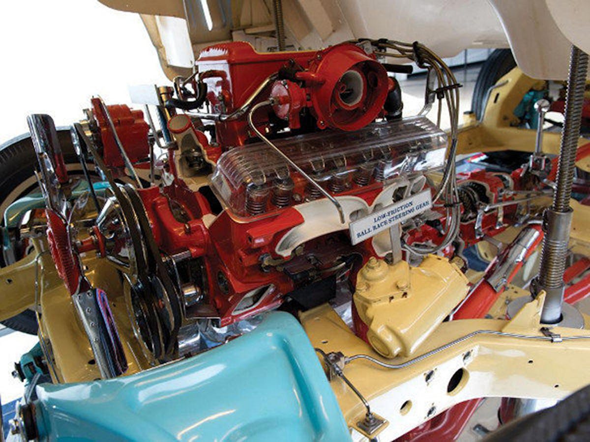 6_Cut4_low_resThe body is mounted to elevating rams, and the body could be lifted from the chassis, leaving the car’s chassis and powertrain exposed. To further expose the inner workings of this machine, careful and well thought-out incisions were made in all of the major components. The frame was then painted a bright yellow, while the engine, transmission and other mechanical components were finished in a bright red hue. When completed, the project cost $1,000,000 to complete in 1965. Adjusting for inflation, that’s nearly $7,500,000 today!