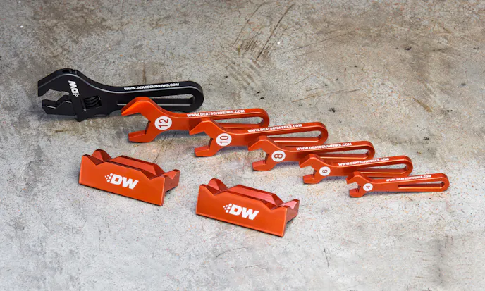 If you thought that DeatschWerks didn’t have anything in the tool department, think again. DW recently released high-grade AN wrenches that are CNC machined, heat-treated, hard-anodized orange aluminum. These super high-grade wrenches have been specially made to work with the DeatschWerks’ growing line fittings. The AN wrenches have chamfered edges to give you a super comfortable firm grip and are the perfect wrenches to have on you at the track or home. They can easily adjust from -4 to-16.