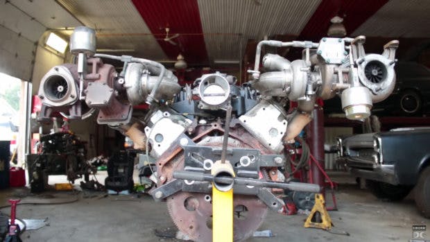 Rich’s team hopes to generate 700 to 800 horsepower from the Chevy V8 with help from those four turbochargers, which are in fact a pair of twin-turbo units borrowed from a Ford Powerstroke diesel engine.