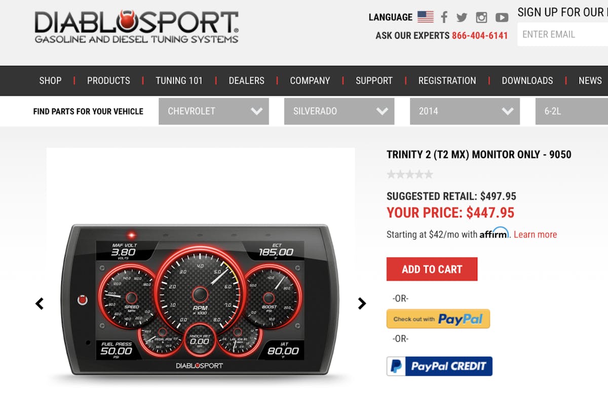 DiabloSport has broken this mold of endless product searches. They now offer a vehicle configurator on their website so you can quickly find all of the products the company makes for a particular car or truck, and it’s easy to use. When you land on diablosport.com, the vehicle configurator is located at the top of the page. From the dropdown menu, you will select the make, model, year, and engine for your car or truck. After you hit the”GO” button, a new page will appear showing you all of the DiabloSport products available for your application. The new page will display handheld programmers, in-cab tuners and monitors, monitors and gauges, in-line modules, Reaper kits, throttle sensitivity boosters, AFM/MDS modules, cold air intakes, exhaust, LIT LEDs, accessories, and apparel from the company.