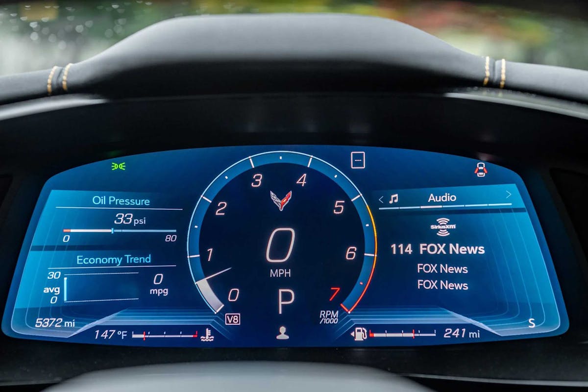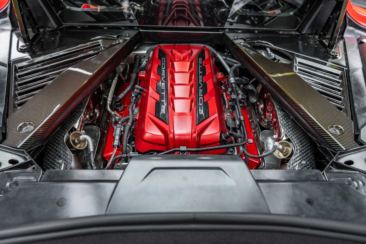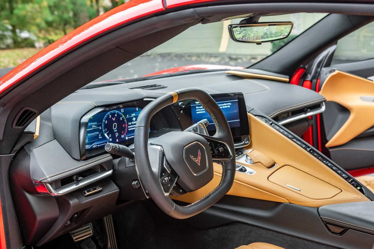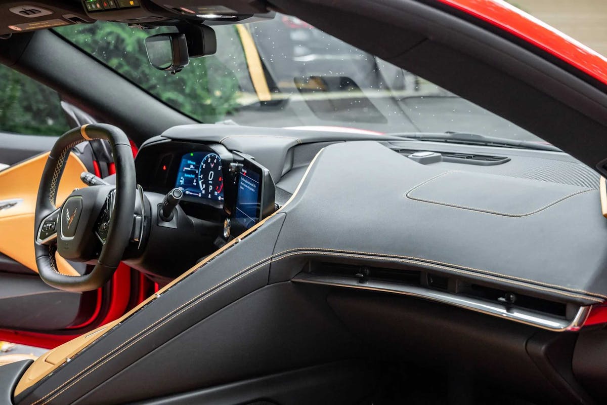 The Torch Red Stingray coupe is fitted with a tan leather interior and a few upgrades you would expect from a guy who has made a very good living by going faster than anyone else – like a radar detector. There is also a coating of paint protection up front, so stone chips from those notorious Michigan roads won’t be an issue for the next owner. Exterior accent pieces have all been dipped in the same shade of red used throughout the entire body of the car, giving it a subtle, clean look.