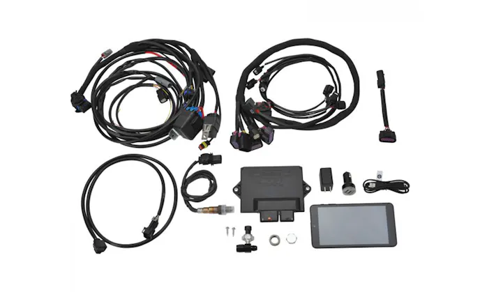 Edelbrock’s Pro-Flo 4+ kit includes a small ECU, which is easy to mount and includes a base calibration. The OEM-style wiring harness offers connections for the MAP, O2, and fuel pressure sensors. A Bluetooth tablet for wireless programming is included with some packages and allows for diagnostics, performance monitoring, and calibration adjustments.