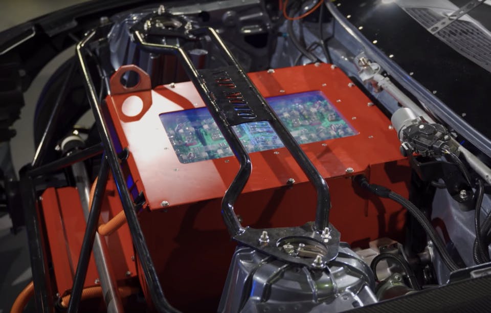 At first glance, the Camaro looks like your standard drift car. Everything on the body is made of carbon fiber except for the roof. It produces an underwhelming 515 horsepower. While this number is low for most drift cars, it makes up for this deficit in the way of torque. The Camaro produces 800-plus ft-lbs of torque which is on par with the Formula Drift field. The difference is, the EL1 is capable of generating 800 lb-ft all of the time. This means that when Travis Reeder, driver of the Camaro hits the accelerator pedal, he no longer has a torque curve. Unlike the gasoline-powered competition, the torque curve is a straight line, and all of that tire shredding power is available on tap.