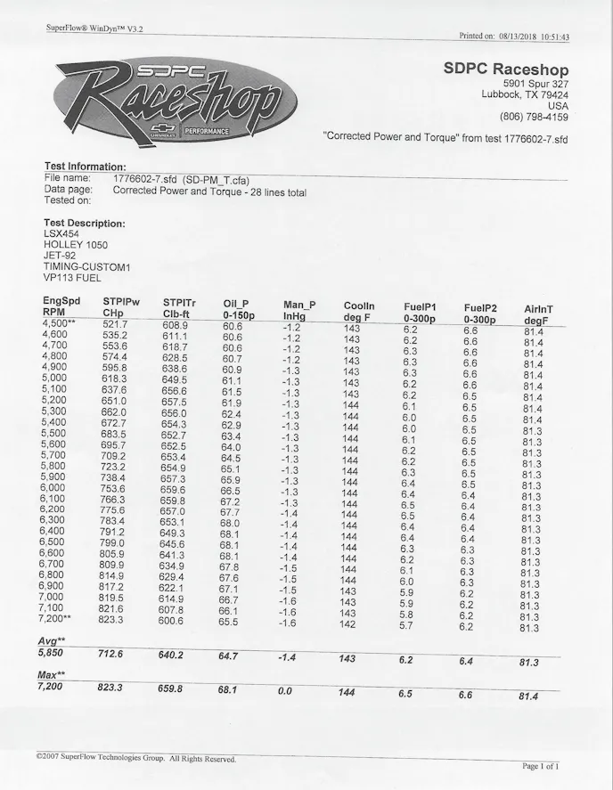 The guys over at Scoggin Dickey Performance Center (SDPC) were kind enough to share their dyno numbers and video with us this week. After they locked down the engine on their SuperFlow Dyno and topped of the tank with VP113, they were ready to make a pull. As you can see from the dyno sheet, it looks like Chevrolet may have been pretty conservative on the power numbers. The LSX454R pumped out a monstrous 823.3 horsepower at 7,200 rpm and 659.8 lb-ft of torque, peaking at 6,100 rpm. The engine produced over 600 lb-ft of torque from the beginning of the pull at 4500 rpm and it never dropped below that, even at 7,200 rpm!