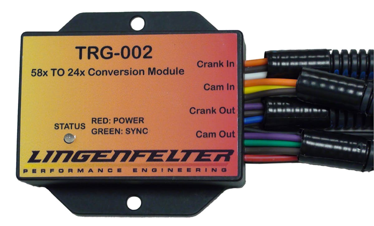 Secondly, you will need to convert the 58x signal back to 24x. This conversion is simple thanks to Lingenfelter’s 58x-24x Crank Sensor Trigger Conversion Module. According to Lingenfelter, “The TRG-002 module allows Gen IV GM V8 engines with the 58x crankshaft trigger or reluctor wheel and the 4x camshaft timing gear to be installed in earlier vehicles designed to accept the 24x crankshaft trigger wheel and the 1x camshaft trigger wheel without having to take the engine apart to change the cam timing gear or the crankshaft reluctor wheel.”