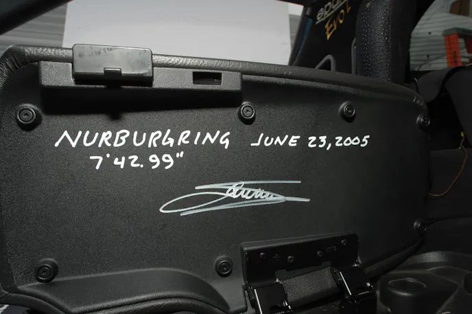 The car has quite a history and comes with a long list of documentation. Like the luggage carried by many seasoned world travelers, this car also wears meaningful tattoos that document the places it has been. An understated, squiggly line serves to illustrate the laps the car has made around the Spring Mountain facilities. An even more prestigious window marker signifies this car as part of the industry pool of cars (for GM) during its stay at the Nurburgring in Germany.
