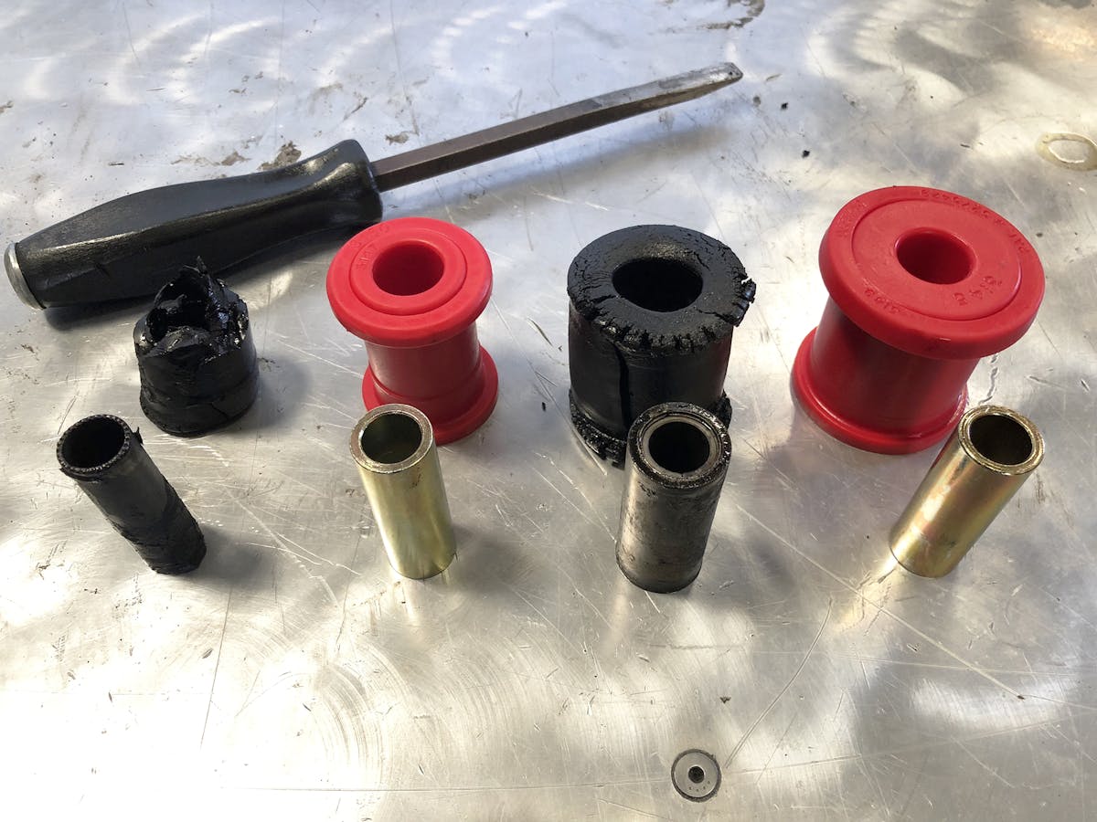 Often the difficulties involved in installing polyurethane bushings include the removal of the OE rubber components, especially if they’re old or worn. Once removed, polyurethane generally slips right in place. The most important and most overlooked aspect of installing polyurethane components involves lubrication. Always grease during installation. Think you’ve applied enough grease? You should probably use some more!