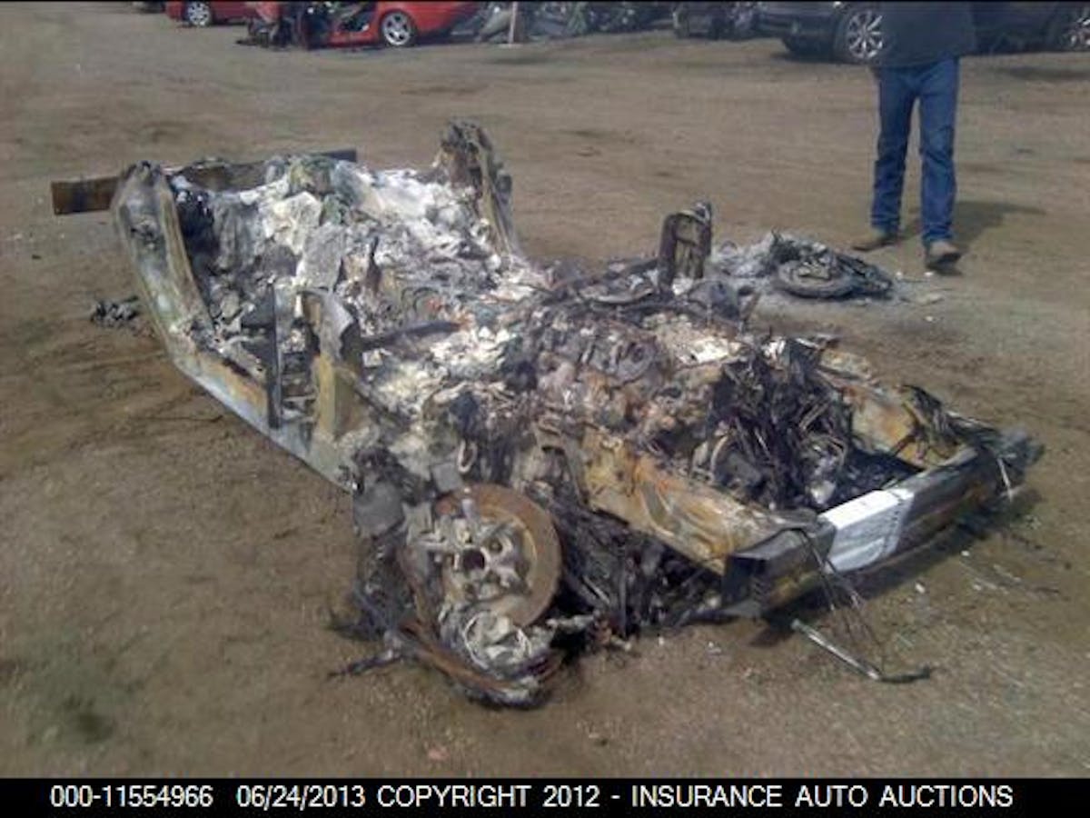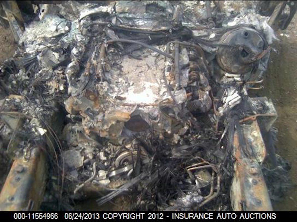 There’s literally nothing that can be saved on this car; even the engine block is nothing but a very large all-aluminum paperweight, frosted with the ash and melted plastic left over from the intake manifold burning away. It might be interesting to take a band saw to it to see what the rotating assembly looks like – were the pistons, rods, and crank damaged by the raging fire as well?