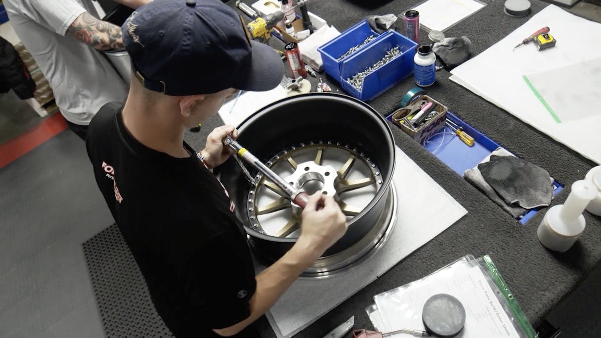 The center receives threaded bolt holes that get Helicoils installed in them so the wheel can be disassembled and reassembled as needed with no danger of pulling the threads out. The other two pieces of the wheel are the wheel halves. There’s an inner and an outer half that are spun aluminum shells sourced from California. Forgeline assembles its three-piece wheels using ARP stainless steel hardware exclusively.