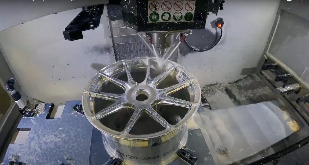 The second type of wheel Forgeline produces and is possibly most known for is its one-piece forged monoblock wheels. As the name implies, the monoblock wheels are made from a single forging of 6061 T6 aluminum. These raw forgings are sourced here in the USA and weigh approximately 140 pounds before they enter the CNC machines. The first CNC machine is a lathe that cuts the forging into the shape of a wheel, and the second machine will do the final milling of the wheel to cut the spokes, lug nut holes or center lock hole, and other details.