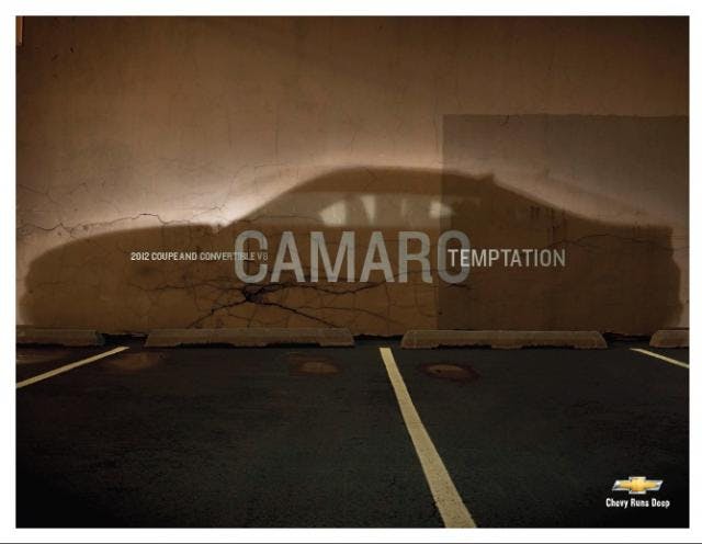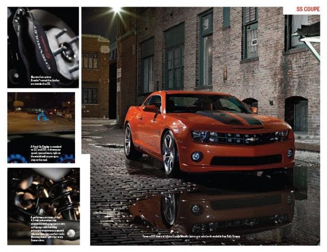 Chevrolet has a way of making their brochures feel more like a good read than a promotional aid. This year, the ‘12 Camaro brochure features detailed poetic descriptions of the coupe and convertible, and some insight on the design of the fifth-generation Camaro from Tom Peters, head of the exterior design team for the car, and Al Oppenheiser, the man credited for engineering the modern muscle machine. Pictures of the Camaro in the brochure include cars in all the available exterior colors, both the coupe and the convertible out in the streets, Gardella Racing’s Formula Drift Camaro, and even images of the 45th Anniversary Edition Camaro.