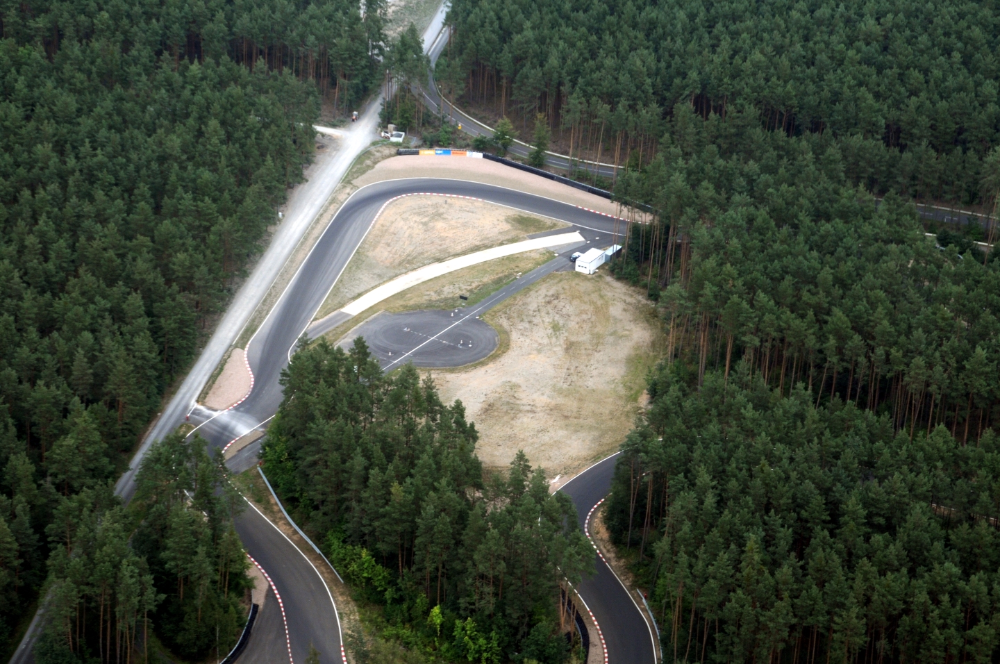 One of the most significant structures that stands out in satellite photos is the circle track on the grounds. It’s a four-and-a-half-mile continuously banked circle course with five lanes posted with speed limits increasing towards the outer lane. The speed limit for the outer lane is 100 miles per hour. With the correct alignment and tire pressures, each lane can be driven at its posted speed without touching the steering wheel to simulate an endless “straight” road. The surface is paved in durable dolomite concrete for extra wear resistance.