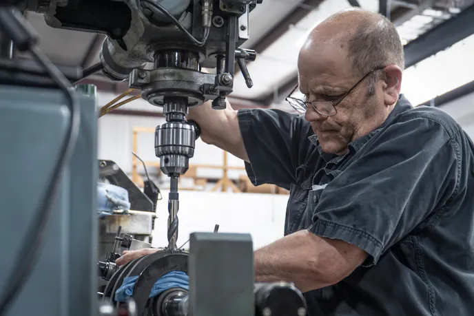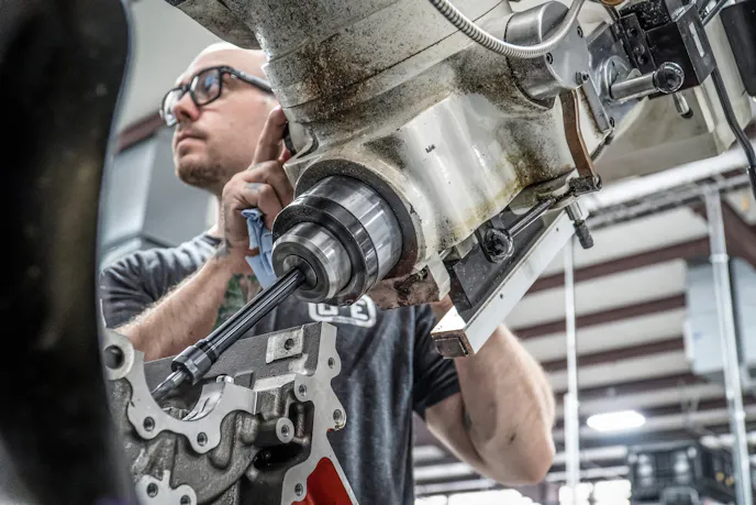 That’s Jim you see there. Jim is taking off some material with LME’s Hines balancer. He uses a spot drill to get the exact spot marked and pre-drilled. Then, he comes in with a full-size drill bit at a much slower speed to remove any erroneous metal. This process allows the LME team to balance cranks at a staggeringly swift pace, with each engine builder balancing that day’s build with the specific crankshaft. This additional level of quality control allows fewer slip-ups and provides a detailed build sheet for every square centimeter of the assignment at hand.