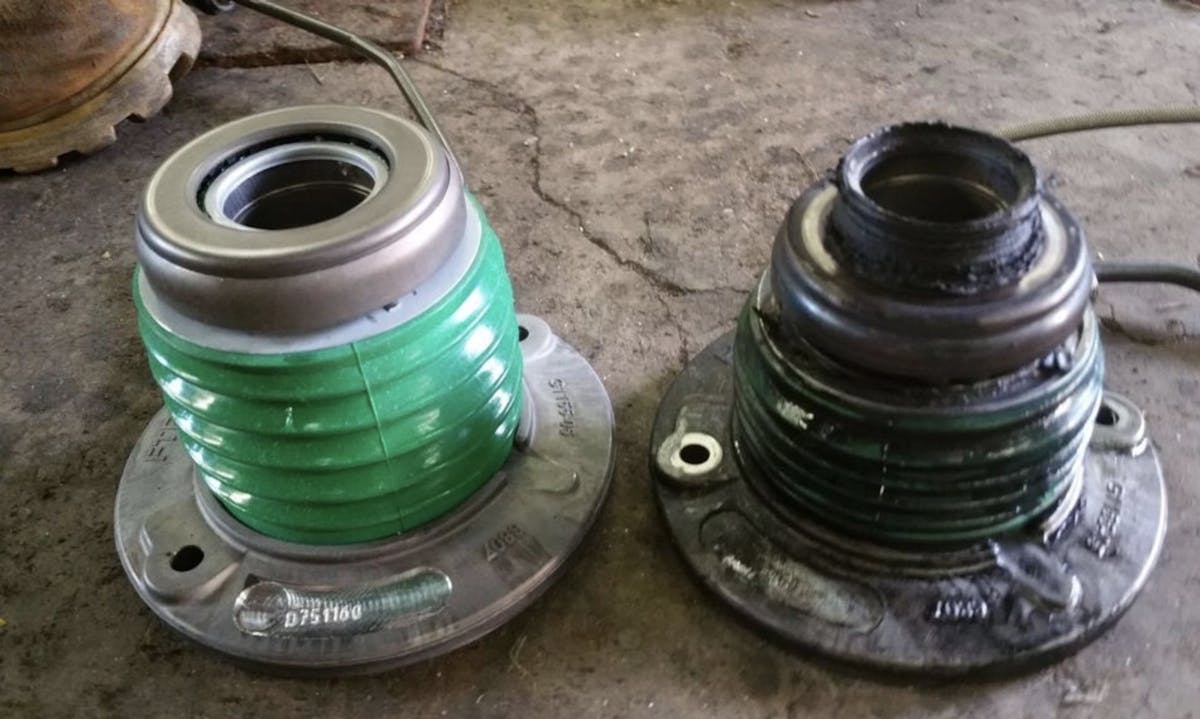In the picture above, you can see where the black plastic bearing support failed due to excessive heat. When the release bearing gets too hot, it will melt the center part of the slave assembly. In this particular case, the fifth-generation Camaro unit also melted the internal seal which allowed hydraulic fluid to saturate the clutch disc. When the slave cylinder fails, you can no longer disengage the clutch assembly which can cause even more problems if you don’t act quickly.
