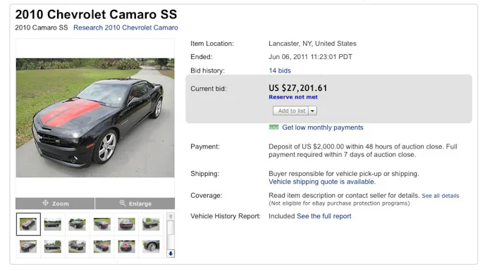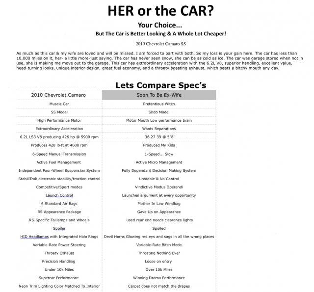 The simplest way to explain it would be that the seller known on eBay as wyliewalczykracing, claiming to be in the middle of an obviously ugly divorce, did a side-by-side comparison of his Camaro and his wife, using a chart highlighting the Camaro’s pros, while choosing to focus on his wife’s faults. Go figure. For example, he tells us that his car has less than 10k miles, while his wife has “over 10k miles.” Another example, although somewhat racy but much more humorous is his description of his Camaro’s neon-trimmed lighting interior, as opposed to his wife’s “carpet not matching the drapes.”