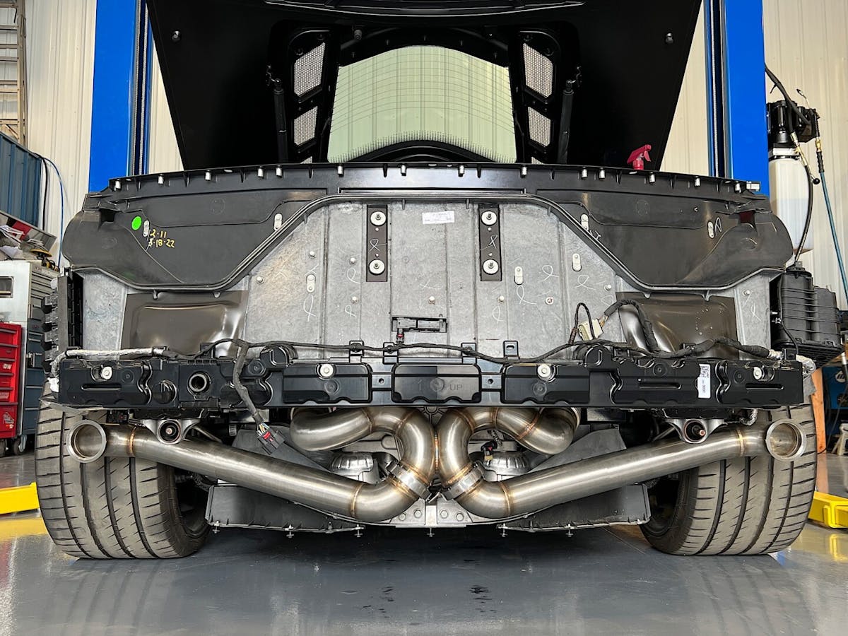 The Vengeance Racing twin-turbo package for C8 Corvettes features Comp Turbo 62 mm turbos, an air-to-water intercooler, wastegates, and factory ECM tuning. The result is 650 horsepower at the wheels utilizing the factory electronics and fuel system. According to Mowen, this twin-turbo package is the base offering from Vengeance Racing, with plans to offer various upgrades and options. In addition to the C8 twin-turbo package, Mowen said they also have a Blackwing in the shop undergoing the full VR treatment which will be tuned with the factory ECM and HP Tuners software.
