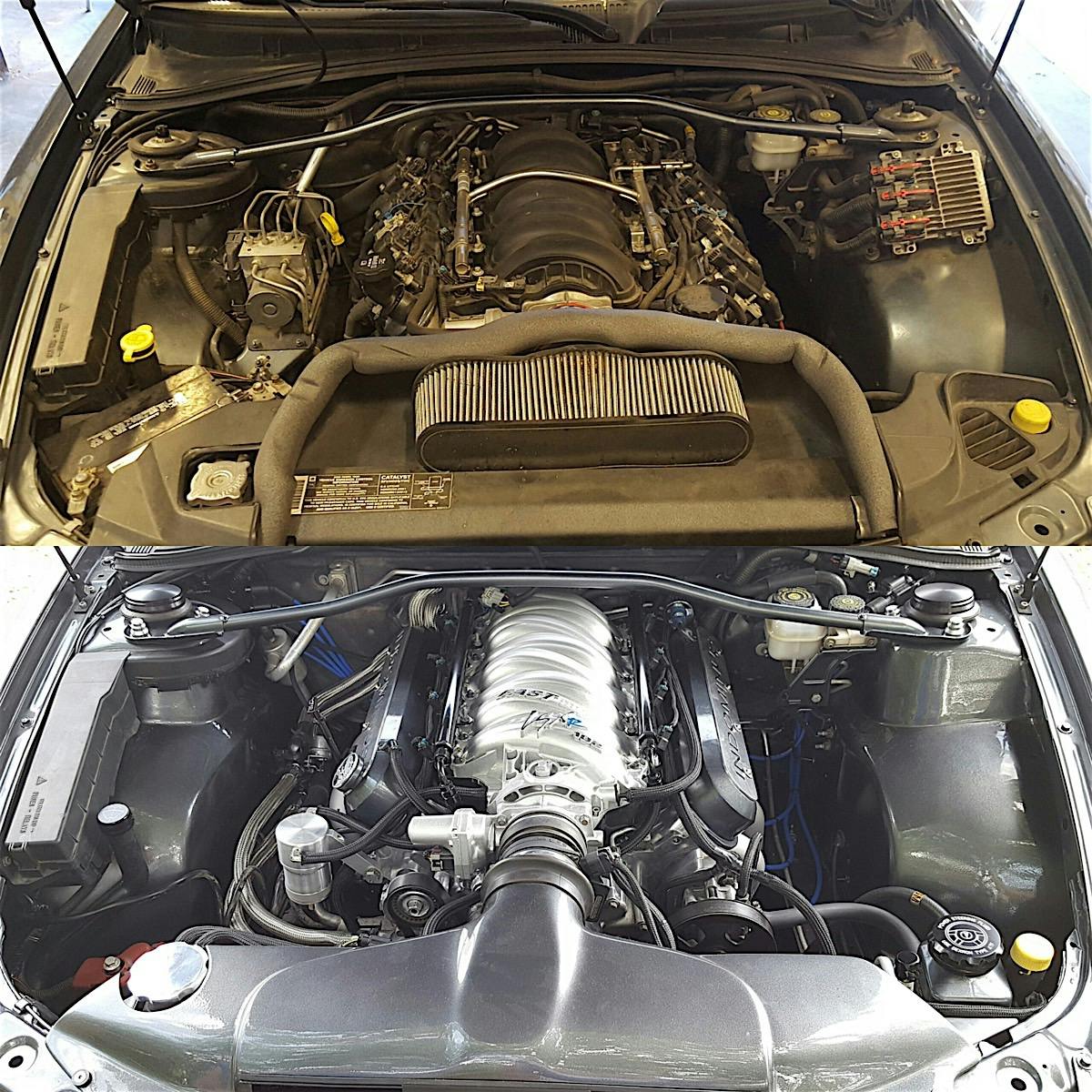 Once the polish work on the motor was finished, the engine was removed once again so that the entire bay—including the firewall— could be smoothed, painted and cleared. While the body work on the engine bay was taking place, Nathan took the opportunity to reroute and hide the stock engine harness and even went as far as relocating the abs module. It now resides lower down, just behind the fog lamp.