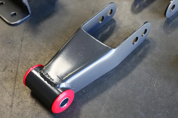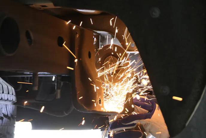 With everything out of the way and the ease of accessing the leaf springs and their mounting points, it was time to get serious. The MaxTrac kit replaces the stock leaf spring shackles. However, those stock shackles are bolted, riveted, and welded to the frame. That means it was time to make some sparks. First, we had to cut/grind/chisel the factory shackles from the frame to make room for the powder-coated versions from MaxTrac. Then, it was time to grind and do our best to keep our fingers safe from the spinning grinder wheel.