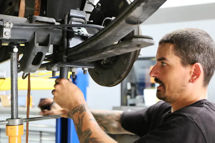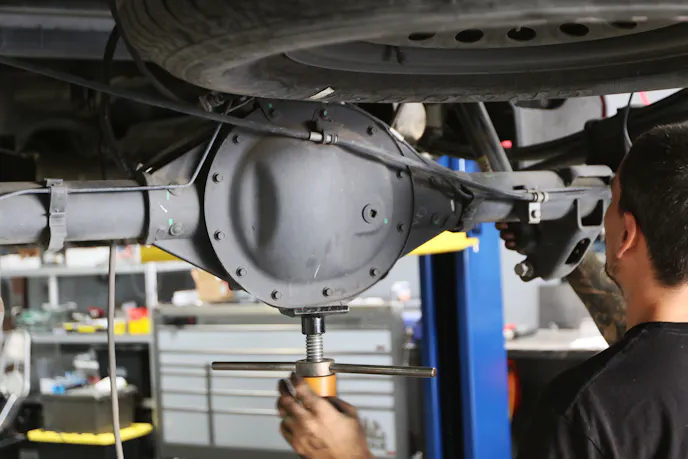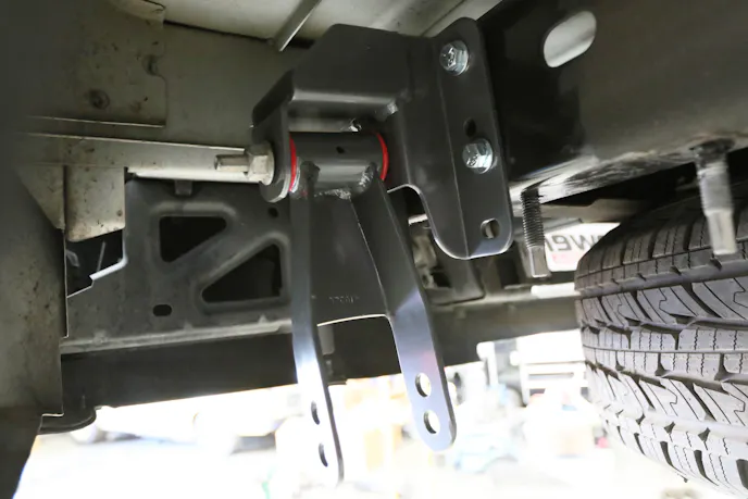 Once we had the outer cover off and the fuel tank removed, we unhooked all of the connections to the tank, including the EVAP tank, which likes to leak fuel on you. We then used a transmission jack to lower the tank out of the way. Next, to assist with access to the leaf springs, we removed the trailer hitch and the rear tailpipes. Finally, we had unadulterated access to the rear suspension we wanted to modify. Because we were going to remove the rear leaf springs and shocks, which hold the axle in place, it’s essential to use a screw stand to hold the axle up safely, because nobody needs a truck axle falling on their head.