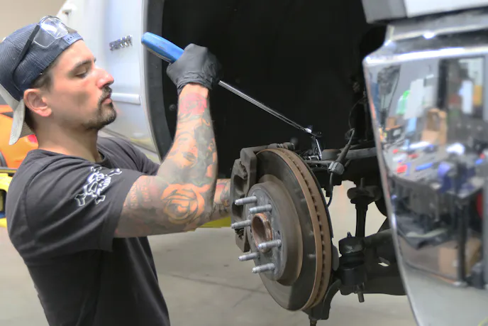 We unbolted the ball joint, tie rod, hub, and ABS sensor from the stock spindle and then slapped in the new lowering spindle. Everything bolted up easily to the new lowering spindles. The only thing we changed was the ABS sensor bracket, which needs to be trimmed to fit on the spindle with enough slack in the ABS wire. This was quickly done with a grinder. After this slight modification, everything worked great.