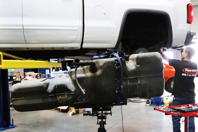 With the front of the truck lowered, drama-free, it was time to take our attention to the rear of the Sierra. The back was more involved because we needed to remove the fuel tank. This is where some planning ahead helps. Truck fuel tanks are big, and fuel tanks filled with lots of gas are cumbersome to deal with. Luckily we brought the Sierra into the shop low on fuel, so dropping the tank wasn’t a complete backbreaker. Nonetheless, the tank was required to be removed to access the inner bolts on the leaf springs and the shackles on the driver side.