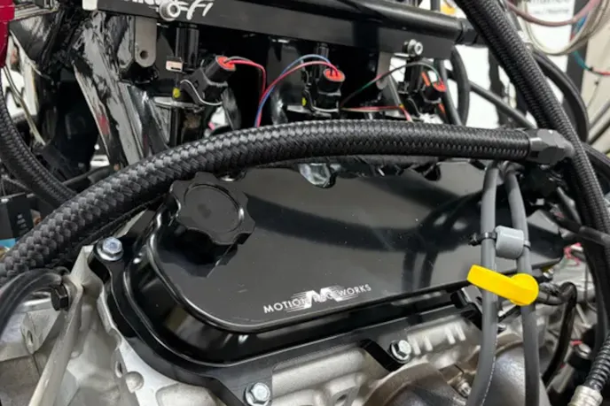 Meanwhile, the valve train received targeted upgrades. SDPC worked with Cam Motion to regrind a camshaft for improved RPM capability. The cam covers 212 degrees of intake duration and 218 degrees of exhaust duration. Valve lift measures 0.564 inch on the intake and 0.558 inch on the exhaust, all on a 113-degree lobe separation angle. An LS3 timing gear pairs with a C5.R chain and an LME tensioner to synchronize the cam and crank. In addition, Johnson 2110R lifters occupy the lifter bores.