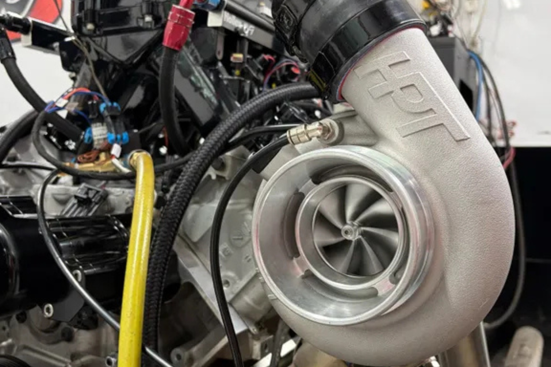 For forced induction, SDPC selected a pair of HP Turbos 6262 dual ball-bearing turbochargers with mirror-image housings. Each turbo carries an 800-horsepower rating, so together they offer airflow for roughly 1,600 horsepower in the right setup. On the hot side, Urban started with factory L8T exhaust manifolds. He sectioned them to match the three-port layout of the 4.3-liter LV3 heads. Then he routed exhaust through custom stainless-steel tubing into each turbine. Go Fast Bits EX38 wastegates control boost, while large dump tubes evacuate spent gases.