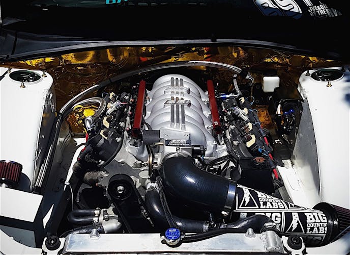 The powerplant, donated by a 1998 Chevrolet Camaro, features the stock 3.898-inch bore but has been stuffed with 12 cc dome-top pistons, Scat rods and a Texas Speed & Performance Torquer 2 camshaft. 243 heads top the mill off while FAST Precision-Flow injectors, housed in a BBK SSI intake, provide the octane and air charge. 1 3/4-inch headers, feeding a custom exhaust, whisk spent exhaust gases away from the Gen III engine.