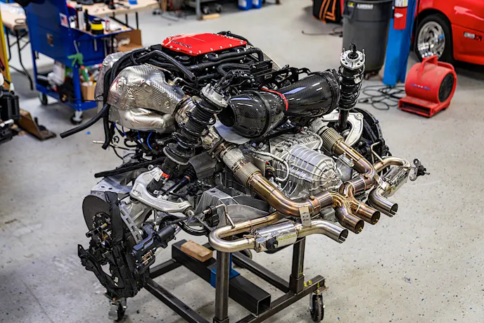 The team at LPE has developed a process using a proprietary engine/transmission cradle that makes removal of the C8’s drivetrain a smooth operation.
