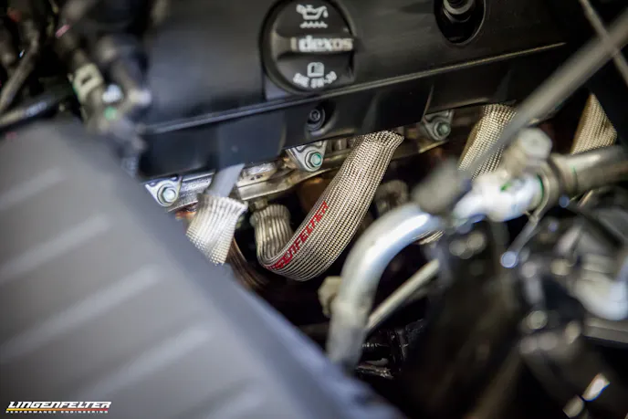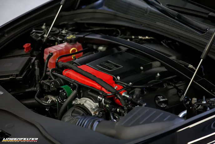 The Lingenfelter treatment gets you their CNC ported/polished LT4 cylinder heads and throttle body mated to an Edelbrock TVS2300 supercharger with K&N air filter producing increased boost. The stock camshaft is upgraded to Lingenfelter’s GT35 LT4 hydraulic roller camshaft with phaser limiter. Internals are strengthened with heavy duty .080-inch wall pushrods, ultra-light solid stem titanium 2.13-inch intake valves and sodium-filled steel 1.59-inch diameter exhaust valves to dissipate the increased heat, while a multi-angle valve job maximizes air flow. Also included are dual valve springs, titanium retainers, and 10-degree locks. Managing all that exhaust flow is American Racing’s 1 7/8-inch longtube headers and high flow cats. At the crank bolts a wet sump LT4 harmonic balancer with 9.17-inch diameter balancer pulley to minimize vibration.