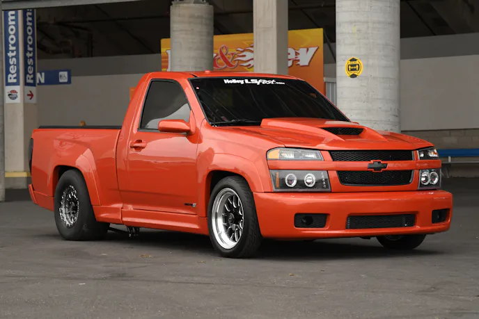 Izzy told us that the smaller, lighter, weight truck is super tame to drive on the street while cruising. On the track, however, it’s an entirely different animal. Power from the 850-horsepower LS9 make its way threw a fully built 4L80 to the Fab 9 inch rear end. The combination depends on a set of Mickey Thompson drag radials to put the power to the ground. The truck’s total weight is a respectable 3800-pounds with Izzy in the driver seat. This combination has a solid platform and has pushed the Colorado to a 9.2-second 1/4-mile time at a speed of 152 MPH.